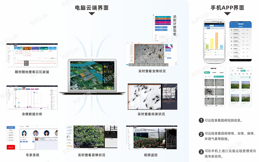 病蟲害監(jiān)測預警系統(tǒng)利用智能化監(jiān)測設備、軌跡分析模型與數(shù)字化預測技術,可滿足各級用戶網頁、手機查詢田間蟲情、苗情、災情、環(huán)境數(shù)據(jù)。同時聯(lián)合作物管理知識、作物圖庫、災害指標等模塊,對作物實施遠程監(jiān)測與診斷,提供智能化、自動化管理決策。